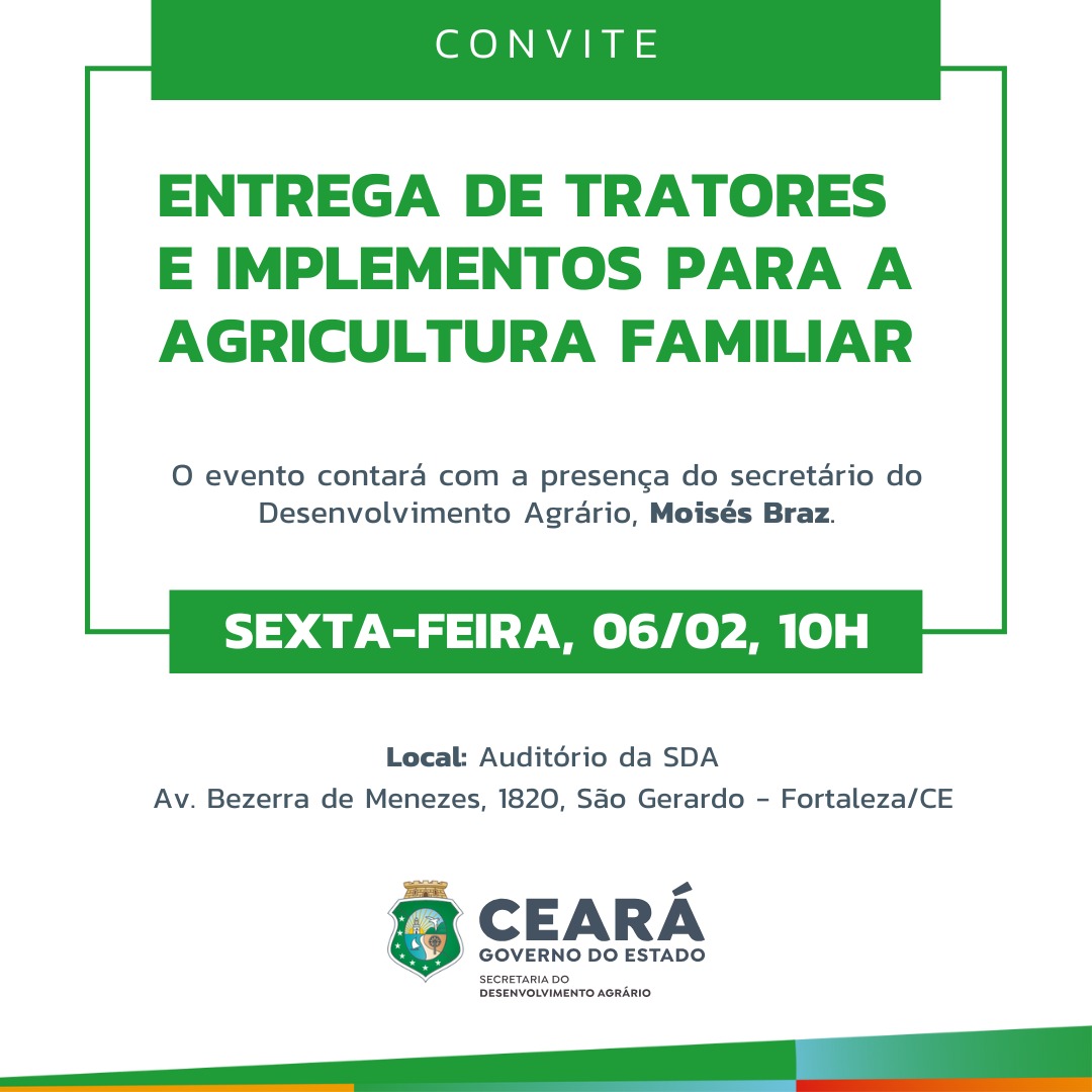 O Governo do Ceará, por meio da Secretaria do Desenvolvimento Agrário (SDA), realiza, nesta sexta-feira (6), às 10h, no auditório da SDA, a entrega de nove tratores a associações de agricultores familiares de nove municípios. A ação, que integra a Política de Incremento e Modernização da Atividade Agrícola do Governo do Ceará, tem investimento de R$ 1,9 milhão.