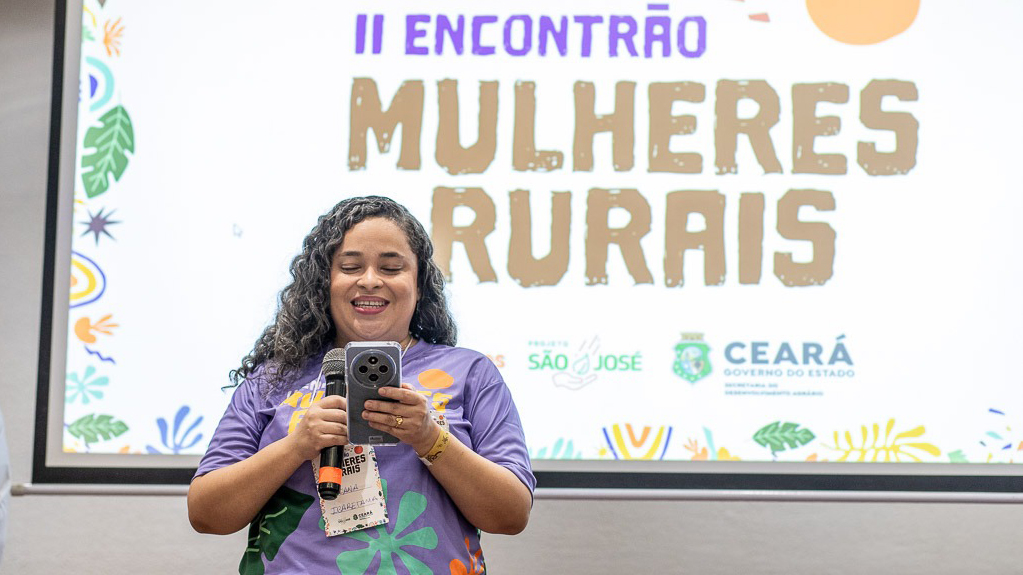 A abertura do II Encontrão Mulheres Rurais ganhou ainda mais força com o depoimento da produtora de suínos e beneficiária do edital, Raiana Nobre. Natural da zona rural de Ibaretama e bióloga de formação, ela emocionou o público ao compartilhar uma fala potente sobre autonomia, permanência no campo e superação de estereótipos, reforçando que, para as mulheres rurais, o êxodo já não é mais o único caminho possível. “Ficar no campo tornou-se uma escolha. Uma opção viável, rentável e importante para a economia. (…) Vejamos nós, todas aqui limpinhas, perfumadas, de batom, de cabelo arrumado. Essa é a imagem que passaremos daqui para frente, de quem somos, de onde estamos e do que fazemos”, destacou Raiana Nobre.